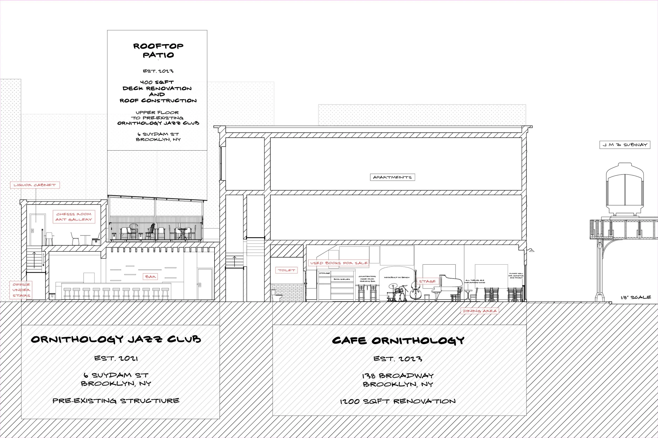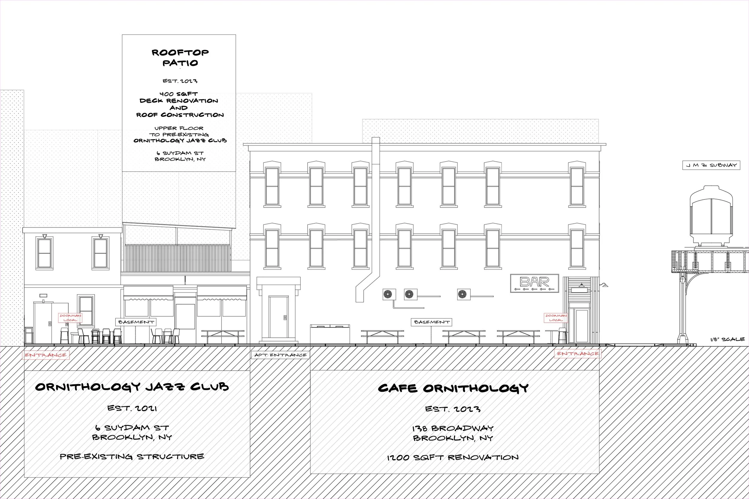 Almost 5 months after I had completed the rooftop above Ornithology Jazz Club, in September 2023, the business had been doing so well they decided to buy the business next door and open a sister club called Cafe Ornithology. Mitchell Borden and Rie-Yamaguchi Borden asked me again to be their architect but this time on a much bigger scale, to build their next jazz club. Mitchell Borden is a jazz legend having been the creator of Smalls Jazz Club, Mezzarow, and Fatcat, three west village jazz clubs that were the epicenter of the jazz renaissance in the 90s in New York City. Being apart of this long line of infamous jazz clubs has been the biggest honor of my lifetime and will hold this project close to my heart forever.